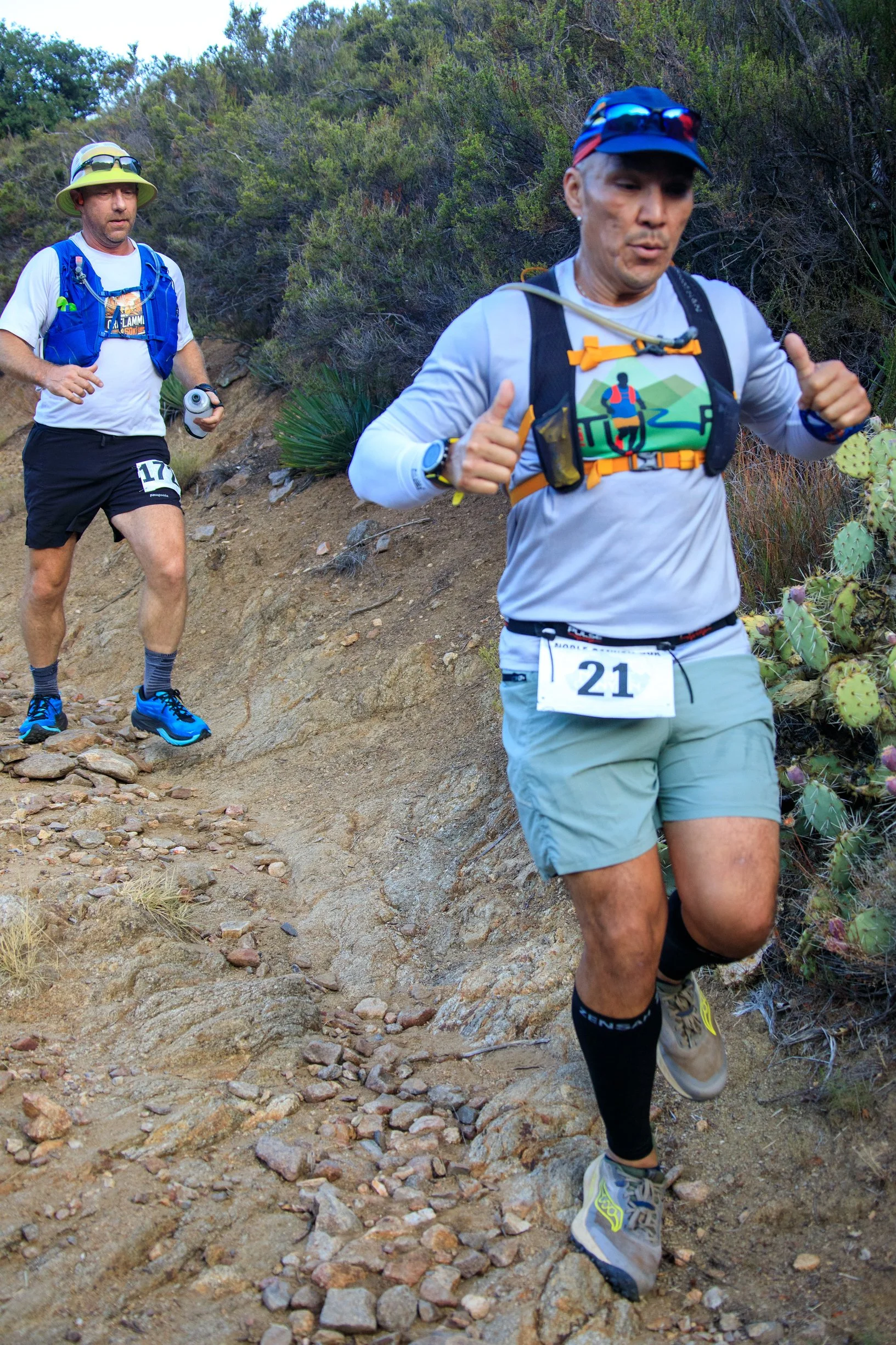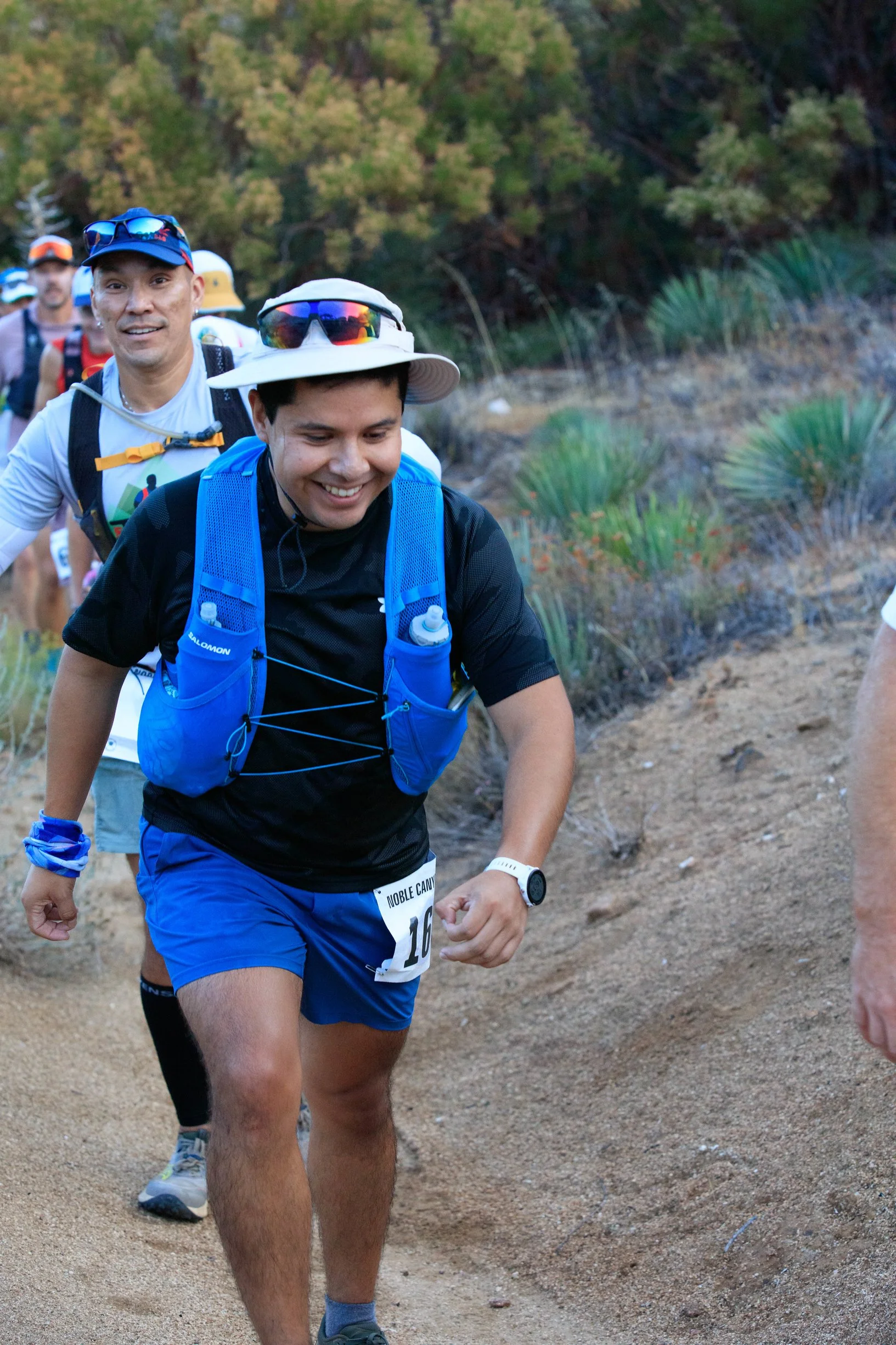 Finally we hit the long sandy patch downhill. I take advantage of it. While others play cautious, I’m able to be a billy goat and scamper and bounce down the hills. It’s really the only good thing I got with trails! The weather’s fairly cool at this point. Some rain the day or two before really helped keep things cool early on. But I don’t expect that to last late in the day. With the jaunt down the trail we finally hit the name sake trail – Noble Canyon.
